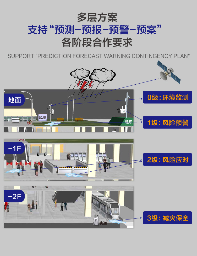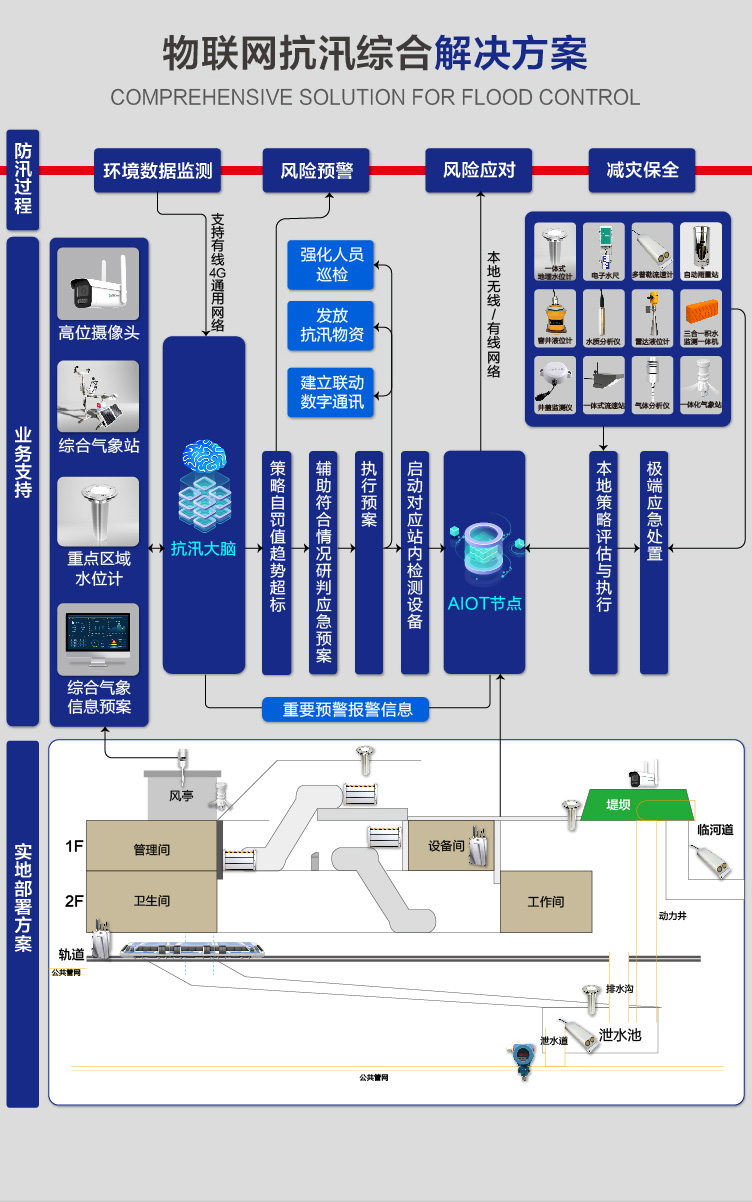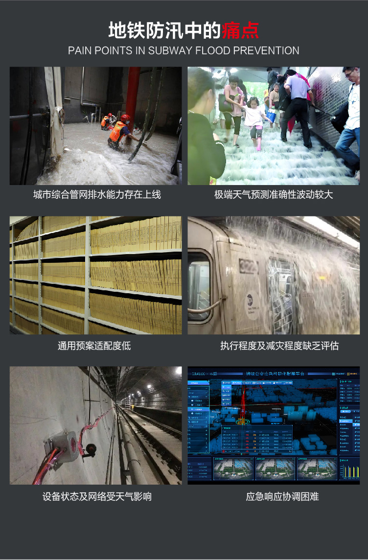 針對城市內(nèi)澇特點(diǎn),結(jié)合地鐵自身特點(diǎn)及相關(guān)事故數(shù)據(jù),特化構(gòu)建此綜合抗汛大腦。防汛大腦提供多源數(shù)據(jù)整合,提供包括氣象數(shù)據(jù)、物聯(lián)網(wǎng)監(jiān)測數(shù)據(jù)、過往業(yè)務(wù)處置數(shù)據(jù)、數(shù)字化應(yīng)急方案響應(yīng)機(jī)制等信息整合,構(gòu)建可視化“中心-站點(diǎn)-傳感器”一體化指揮駕駛艙,提升管理質(zhì)量及速率。