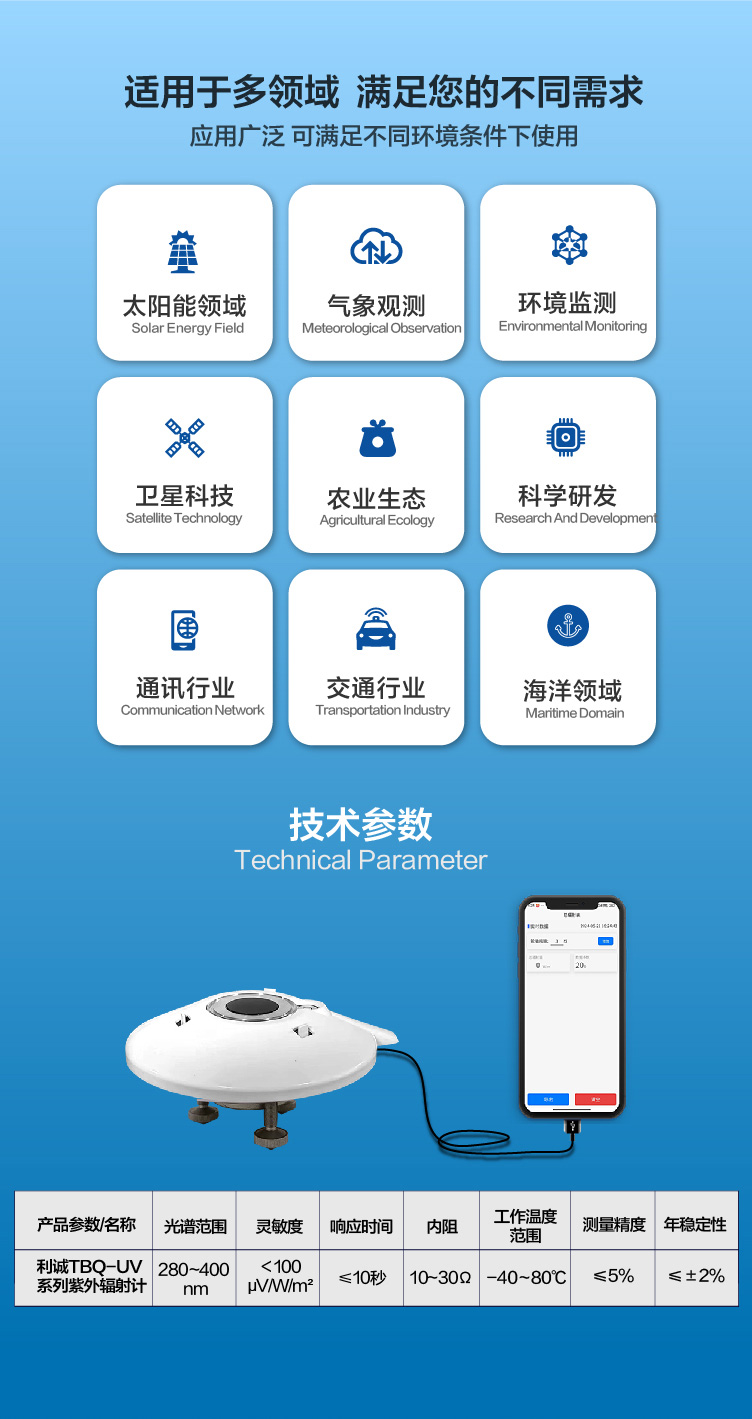 手持紫外輻射計(jì)是一款便攜式高精度測(cè)量設(shè)備,專為快速檢測(cè)并量化紫外線(UV)輻射強(qiáng)度而設(shè)計(jì)。它廣泛應(yīng)用于環(huán)境監(jiān)測(cè)、紫外線消毒效果評(píng)估、戶外工作者健康保護(hù)、科研實(shí)驗(yàn)以及皮膚保護(hù)產(chǎn)品測(cè)試等多個(gè)領(lǐng)域。通過(guò)直觀的數(shù)字顯示,用戶可輕松掌握紫外線強(qiáng)度,有效預(yù)防紫外線過(guò)量帶來(lái)的危害,確保工作與生活環(huán)境的安全與健康。